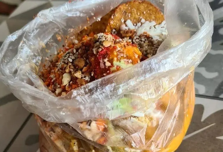 Esto es depositado en una bolsa transparente, a la que se le agrega una diversidad de aderezos como mayonesa, crema, chile y demás.