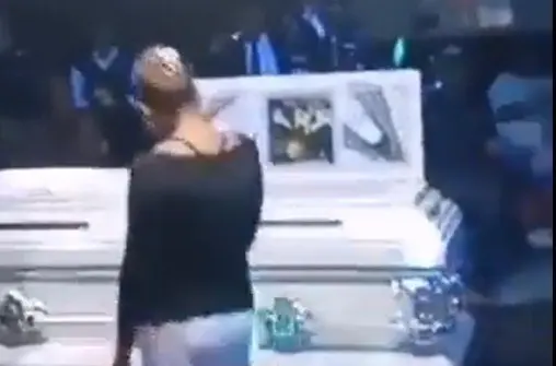 Mientras la música sonaba a todo volumen, la mujer rodea el féretro y empieza a darle un baile.
