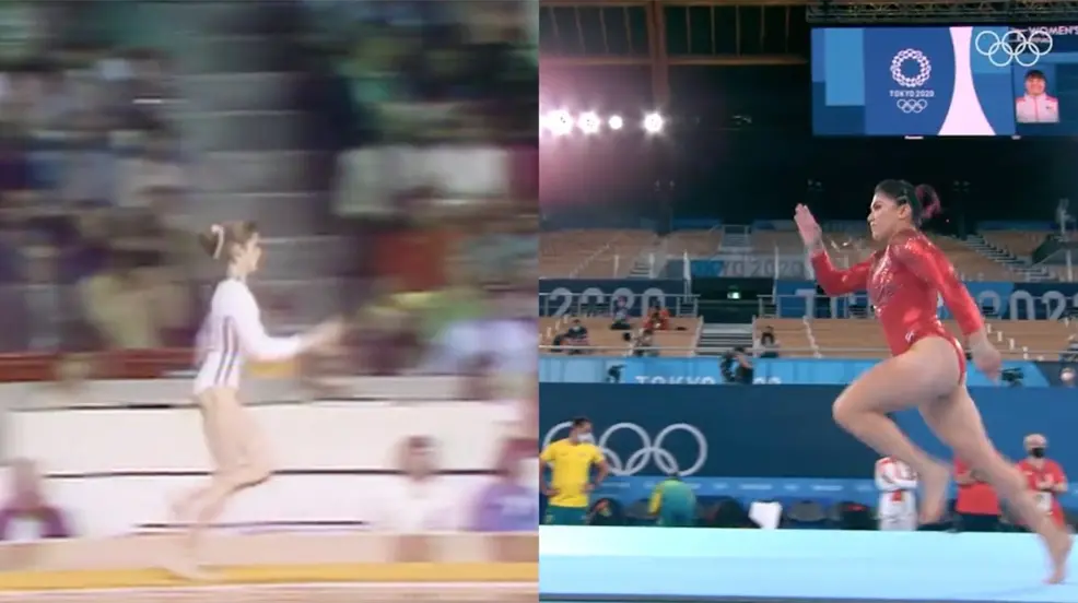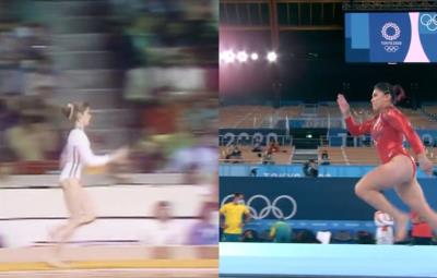 En una misma publicación, se muestra un fascinante video donde se aprecia a la mexicana Alexa Moreno ejecutando su propio salto de caballo en los Juegos Olímpicos de Tokio 2020, junto al legendario salto de Comaneci.