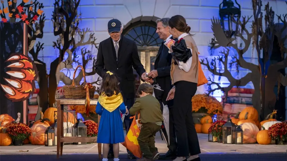 WASHINGTON DC, Estados Unidos.- Como parte de la tradicional celebración de Halloween en la Casa Blanca llamó la atención de muchas personas los hijos del secretario de Estado, Antony Blinken, que fueron a pedir dulces disfrazados de… bandera de Ucrania y del presidente de dicho país, Volodimir Zelenski.