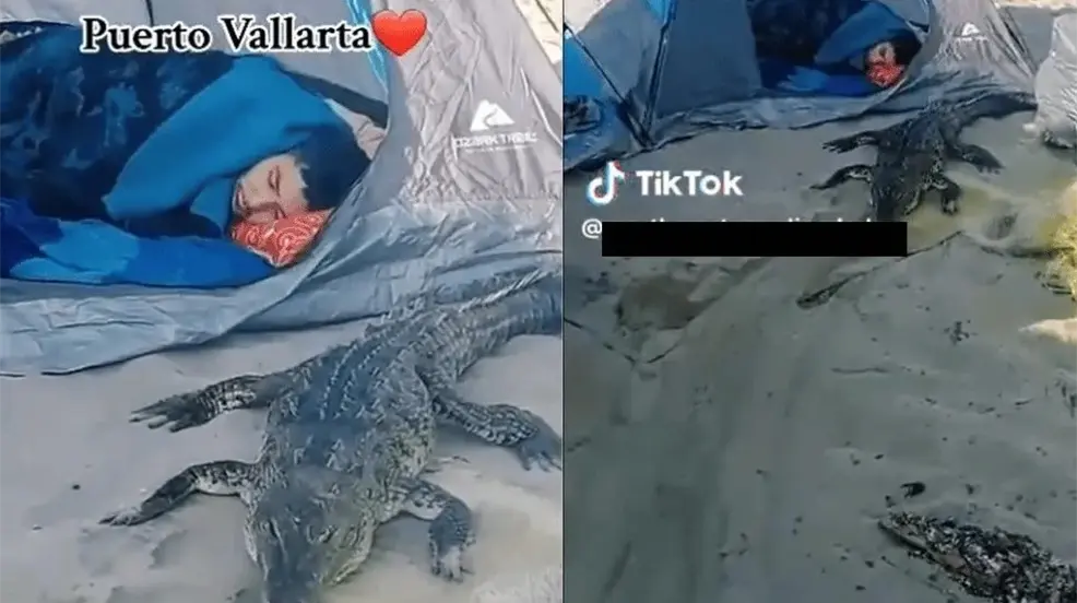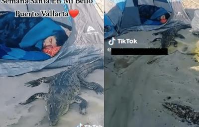 GUADALAJARA, Jalisco.- Un video que circula en redes sociales se ha vuelto viral por la escena increíblemente peligrosa que se muestra y es la de un joven que, dormido al interior de una casa campaña, comparte el espacio en la playa con un cocodrilo, que reposa plácidamente a su lado.