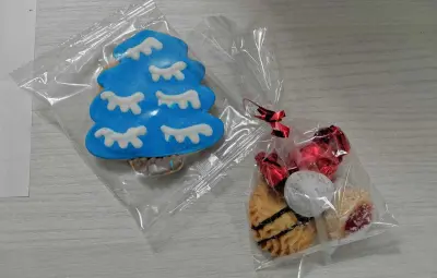 - Bolsas con mensaje personal: Usa bolsitas transparentes y coloca galletas o bombones; acompáñalos con una nota agradeciendo la colaboración del año.