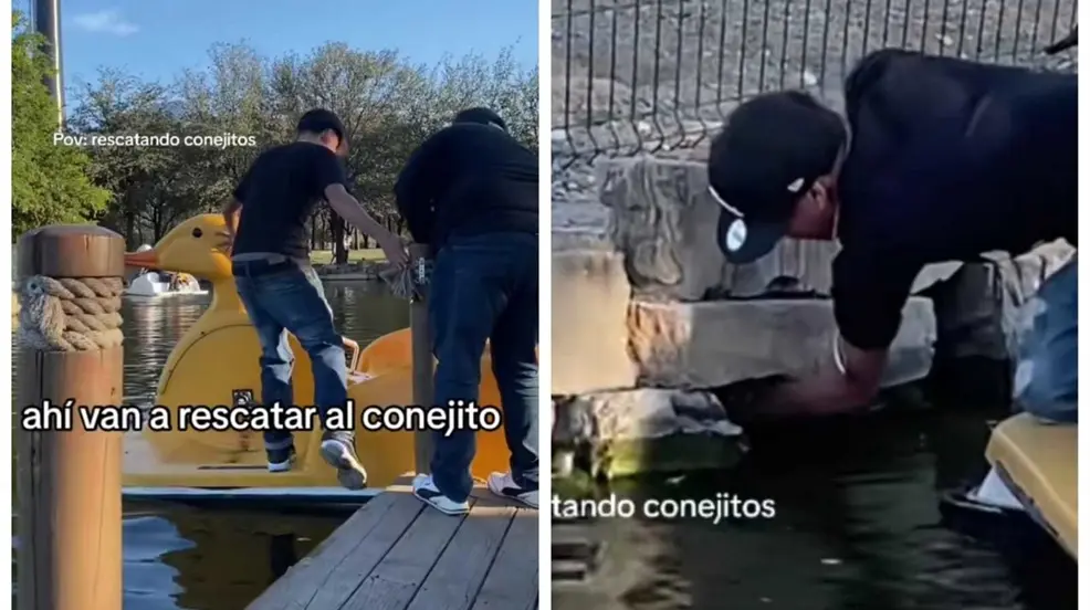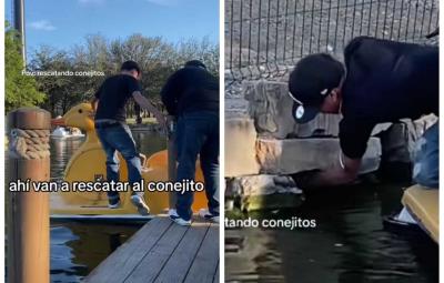 En las imágenes se puede observar cómo el grupo de jóvenes decide actuar rápidamente para salvar al conejito, que se encontraba atrapado entre una piedra y el agua del lago. Sin pensarlo dos veces, subieron a un bote de renta del parque y se dirigieron hacia el pequeño animalito.