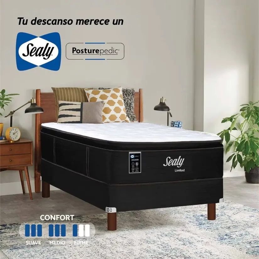Los colchones Sealy son reconocidos por su tecnología de soporte y confort, este modelo en particular está diseñado para ofrecer un descanso firme, pero cómodo, adaptándose a la forma de tu cuerpo y asegurando una alineación correcta de la columna vertebral.
