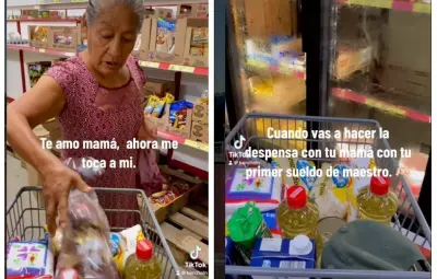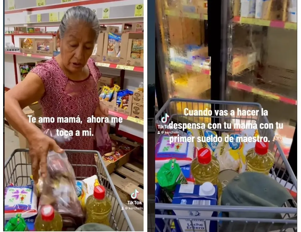 NUEVO LEÓN.- El usuario de TikTok @kercheln, residente del municipio de Cazones de Herrera en Veracruz conmovió a miles de personas al compartir un video en el que muestra el momento en el que llevó a su mamá a realizar la compra de una despensa con su primer salario como maestro.