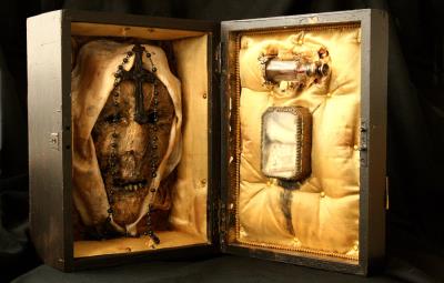 Dentro de una caja de madera había cuatro objetos importantes. La parte frontal conservada de su cráneo y rostro, un frasco de su sangre dentro de un recipiente de vidrio y dentro de una caja de pan de oro, un mechón de su cabello y un fragmento de su segundo tratado.