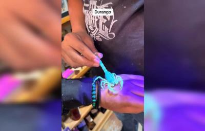 DURANGO, Durango. - Un comerciante de Durango, le mostró más de cerca un alacrán a unos turistas que visitaban la capital duranguense, específicamente el mercado de Gómez Palacio ubicado en el centro histórico de la ciudad, en este sitio abunda la venta de "Recuerditos" los cuales poseen como característica principal un arácnido de este tipo, hay desde llaveros hasta relojes de alacranes.