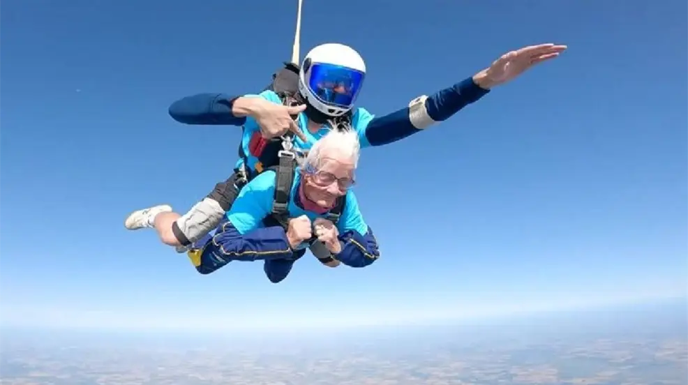 Manette Baillie, una mujer de 102 años celebró su cumpleaños lanzándose desde un avión en paracaídas.