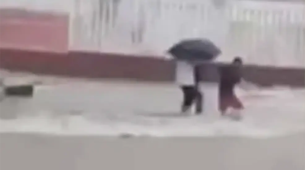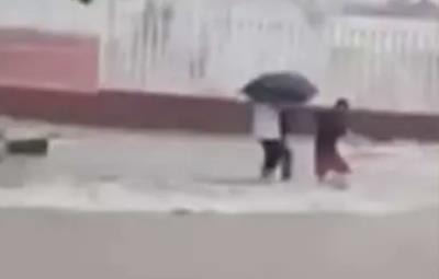 En un momento, el hombre estuvo a punto de perder el equilibrio, pero logró mantenerse en pie con una maniobra, aunque soltó la sombrilla que los resguardaba de la lluvia. Finalmente, padre e hijo lograron llegar al otro extremo, tan solo con el susto de ser casi arrastrados por la corriente y sin su paraguas.