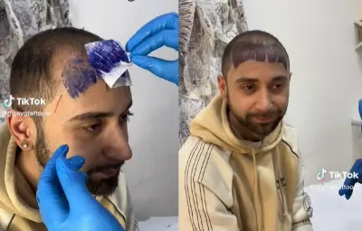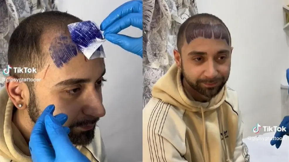 El hombre acudió a un negocio de tatuajes donde fue antendido por una mujer y tras elegir el tipo de flequillo le realizaron el tatuaje; el joven parecía estar emocionado al pensar que encontraría una solución rápida y efectiva a su problema de calvicie.