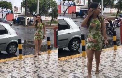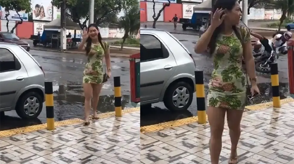 Los hechos fueron captados en video y en las imágenes se puede observar cómo la mujer con el minivestido en color verde y estampado caminaba por una calle donde había un gran charco luego de varios minutos de lluvia, la dama logra subir a la banqueta y saluda a la persona que la está videograbando e instantes después se produce el choque entre un automovilista que giró desde el carril central hacia la derecha en dirección donde se enontraba la mujer y un motociclista que tampoco tuvo la precaución de conducir a velocidad moderada.