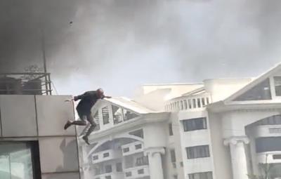 En las mismas, se ve a un hombre aferrado a la esquina de la terraza del edificio de cuatro pisos mientras el fuego continuaba propagándose.Miró el fuego hacia su derecha y luego hacia el suelo, entonces de repente saltó.Él y otra persona sufrieron heridas graves y fueron ingresados en un hospital privado.