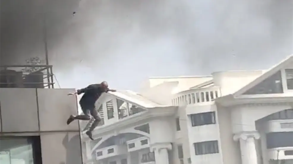 El incendio en un edificio a causa de una explosión por tanques de gas obligó a un hombre a saltar desde lo alto del inmueble para escapar en la ciudad de Bangalore, en la India.