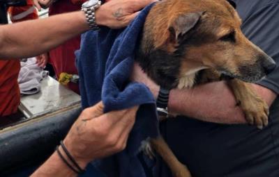Los rescatistas lograron subir al perro a una embarcación, donde lo auxiliaron para evitar la hipotermia.