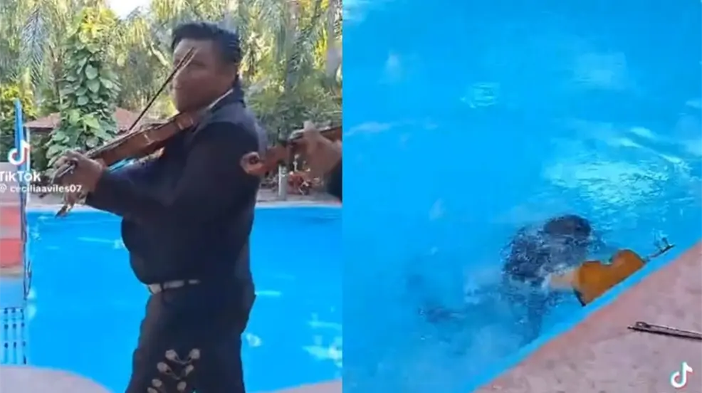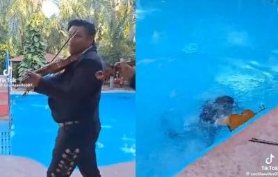 CIUDAD DE MÉXICO.- Un mariachi que toca el violín y que llegaba con su agrupación a dar una serenata cayó a una alberca ocasionando las risas de sus compañeros así como la de la cumpleañera y sus invitadas.