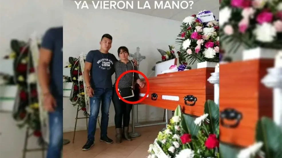 La imagen en cuestión muestra a la pareja junto a un ataúd, pero lo que ha llamado la atención de los internautas es lo que parece ser la aparición de una mano fantasmal a un costado de la mujer. Mientras algunos aseguran que se trata de un espíritu, otros argumentan que en realidad es una pinza para el pelo que la mujer colocó en uno de los tirantes de su bolsa.