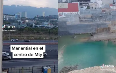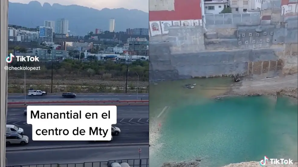 Mediante la cuenta de Tiktok @checkolopezt del usuario Checko López, se documentó la aparición de un manantial de agua color turquesa en un pozo de construcción de un edificio de Monterrey.
