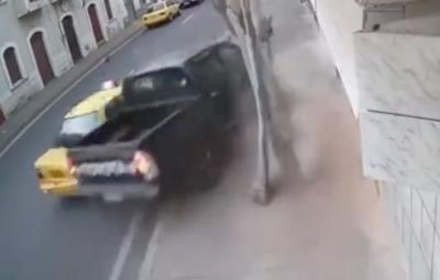 Finalmente la camioneta se estrella contra el muro y se observa cómo sale un hombre del lado de la puerta del conductor y también desciende del vehículo otra persona que viajaba como copiloto.