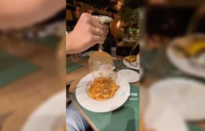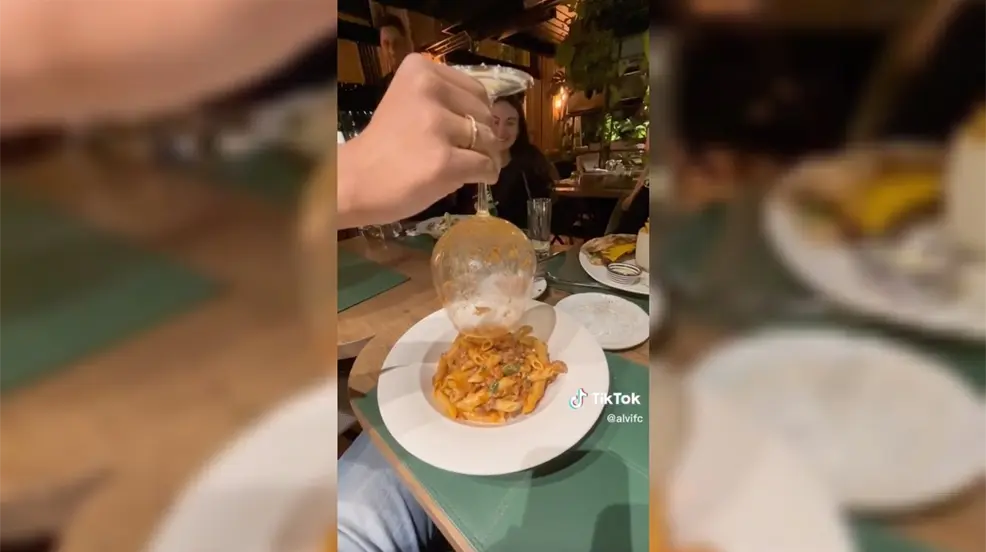El video en cuestión, muestra como un restaurante decidió poner la pasta en una copa de vidrio sobre un plato en la mesa, el mesero levanta la copa y libera la pasta, agregando al espectáculo, se pone una porción de queso en el tope de la copa, el cual cae sobre la pasta.