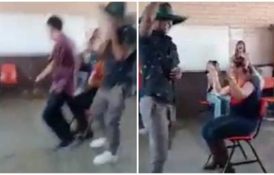 El video muestra a la maestra sentada en una silla, mientras alumnos se turnan para “perrear” frente a ella.
