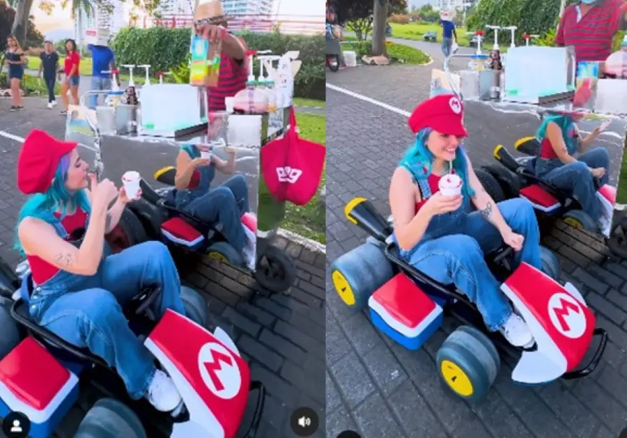 Una creadora de contenido geek asistió al estreno de la cinta 'Mario Bros', usando un sombrero de Mario, conduciendo un go-kart.