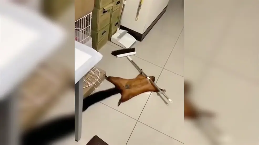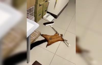 En el clip publicado en Twitter, se puede ver cómo la pequeña ardilla recorre un pasillo, pero al tirar la escoba y verse descubierta pareciera que finge su muerte y arma la escena delante de los testigos.