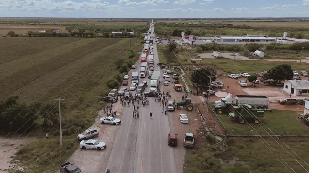 En San Fernando se registró el bloqueo más grande del estado, sobre la carretera Victoria-Matamoros. Productores agrícolas se colocaron en la vía para exigir atención inmediata a sus demandas.
