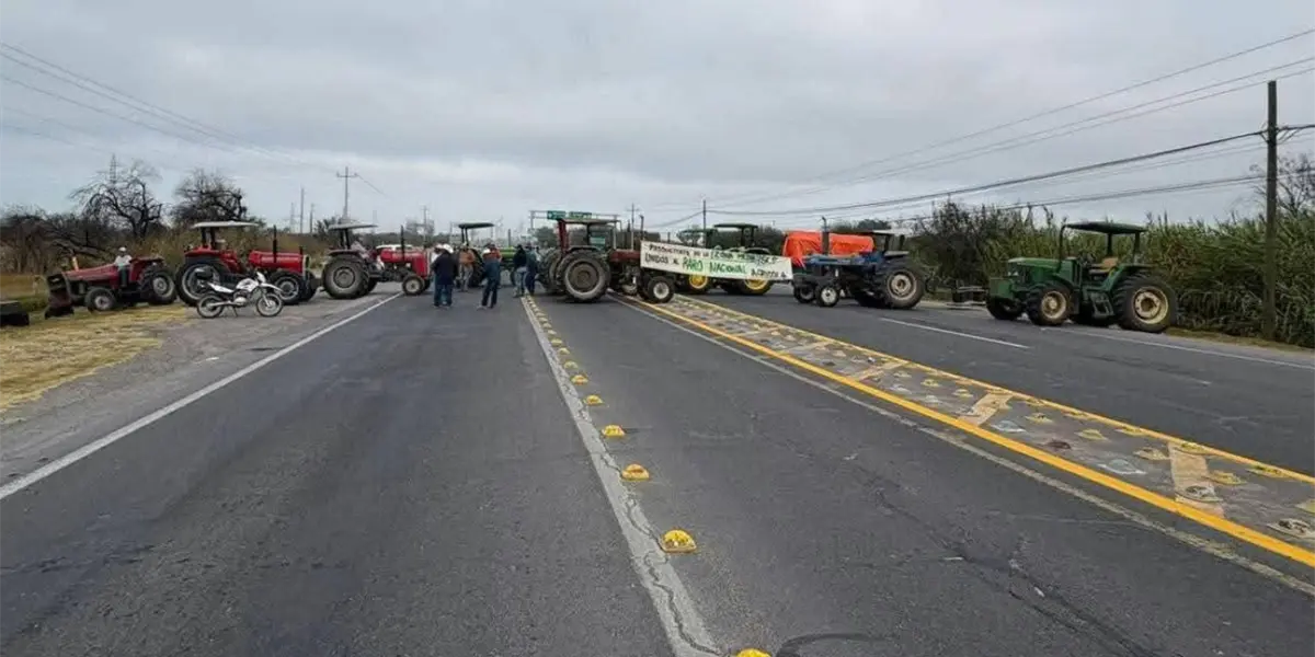 Productores bloquean carretera federal en el kilómetro 201 Victoria-Matamoros-Reynosa a la altura de la Bodega la Herradura del ejido Francisco Villa del Municipio de San Fernando, Tamaulipas.