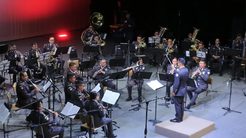 Más tarde, el teatro Amalia G. de Castillo Ledón recibió a la Orquesta Sinfónica de Alientos, dirigida por el maestro Remigio Reyes González, que ofreció el concierto “Un paseo por México”, con piezas representativas de la música nacional adaptadas para instrumentos de viento.