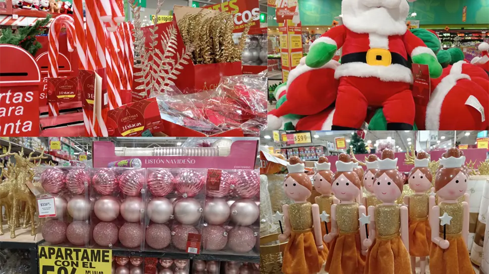 En una visita por algunas tiendas de Tamaulipas, se pueden apreciar todo tipo de adornos y decoraciones navideñas; un ejemplo es Soriana, donde hay: