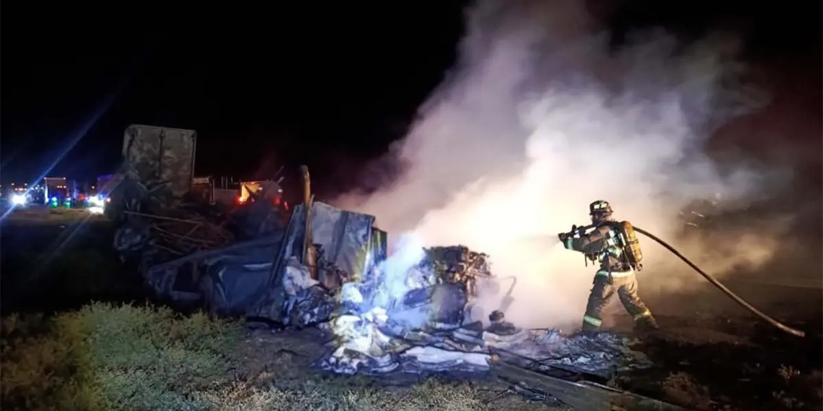 Las imágenes proyectan la magnitud del siniestro: una cabina reducida a estructuras metálicas retorcidas y un tráiler completamente calcinado sobre la carpeta asfáltica.