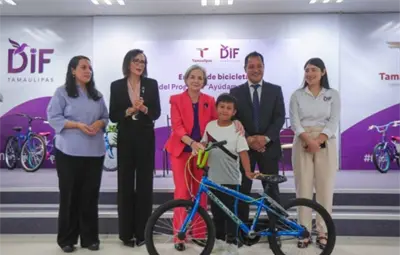Con el compromiso de impulsar la educación y apoyar a la niñez de comunidades rurales, el Gobierno del Estado, a través del Sistema DIF Tamaulipas que preside la doctora María de Villarreal, en coordinación con la Fundación Telmex Telcel, realizó la entrega de 100 bicicletas a niñas y niños de siete municipios como parte del programa “Ayúdame a llegar”.