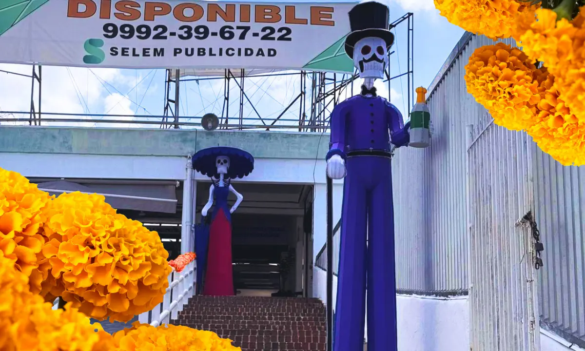 Flores de cempasúchil, calaveras gigantes y un altar del hanal pixán es lo que adorna La Placita en el mercado Lucas de Gálvez
