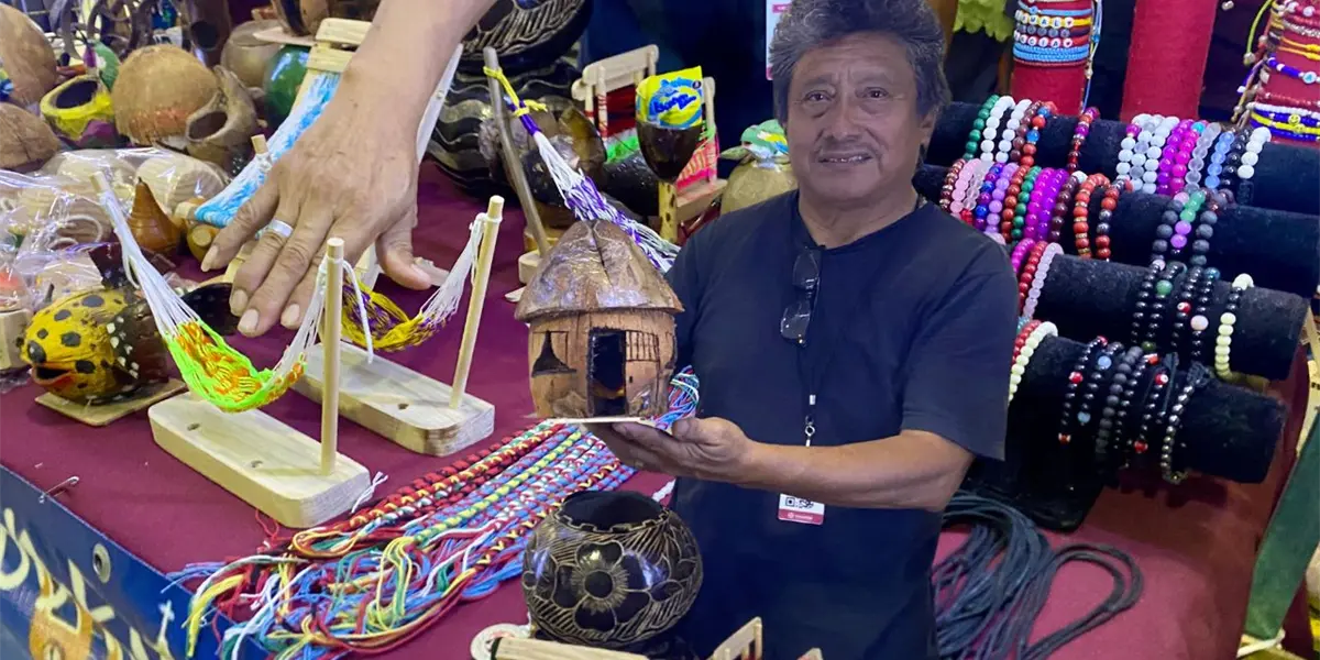 Desde Izamal, Ka’bo’ob Ku Meyajo’ob lleva tallado de coco, juguetes tradicionales, urdido y artesanía regional.Entre sus productos más solicitados estuvo el “peine de la Xtabay”, una pieza hecha con una fruta endémica y asociada a la leyenda maya, que se agotó durante la feria.