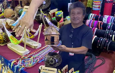 Desde Kanasín, Erzanoli ofrece pulseras de gemas, bolsas, sombreros y piezas bordadas elaboradas por artesanos de Seyé. Su representante, María Santillán, agradece la oportunidad de participar por primera vez en la feria tras ser seleccionada en la convocatoria del IYEM.