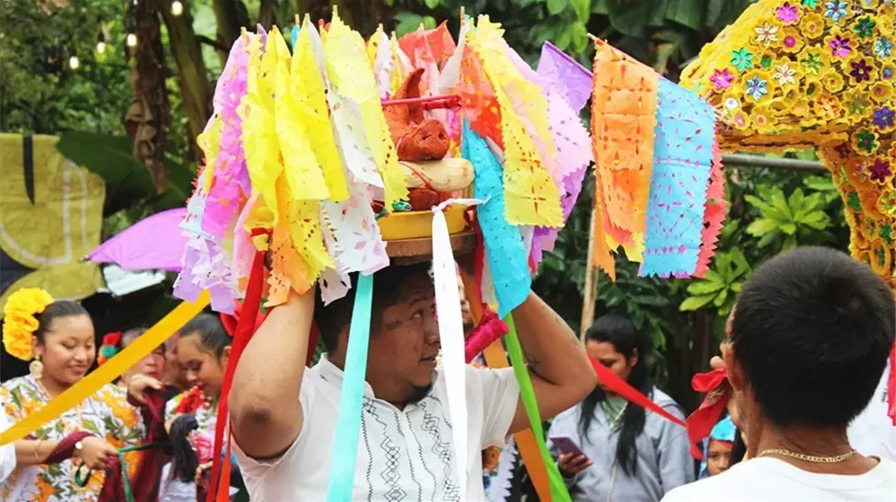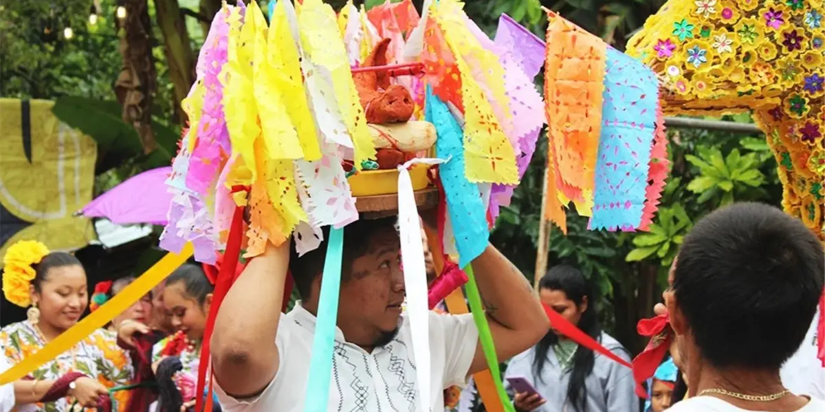Uno de los momentos más representativos de la Navidad maya es la preparación del ramillete de estrella, una estructura artesanal decorada con flores de cera hechas a mano. Esta estrella simboliza la de Belén y encabeza una procesión acompañada por charanga jaranera.