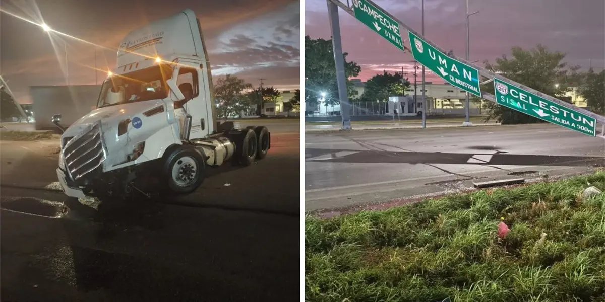 Según el reporte de las autoridades, el hecho se registró a la altura del kilómetro 41+100, cerca de la vía que va hacia Celestún, cuando el conductor de un tráiler perdió el control, impactando un señalamiento tipo bandera, haciendo que la estructura cayera sobre el pavimento y bloqueara por completo las tres vías de circulación.