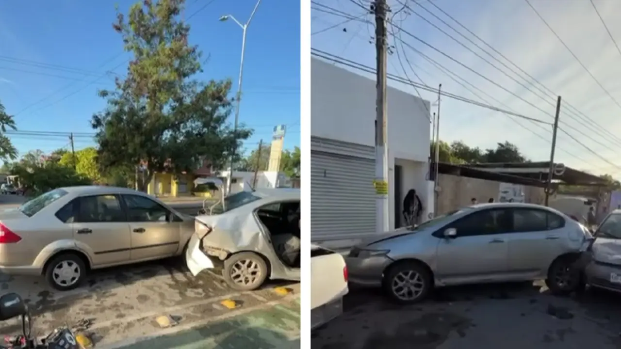 Fuerte choque en San Antonio Kaua, Mérida, dejó varios vehículos y una motocicleta dañados. No hubo lesionados; el conductor quedó bajo custodia.