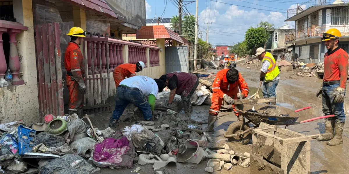 La brigada Yucatán continúa su labor en Poza Rica, Veracruz, apoyando la limpieza, desazolve y recuperación de viviendas y calles afectadas por las recientes inundaciones.