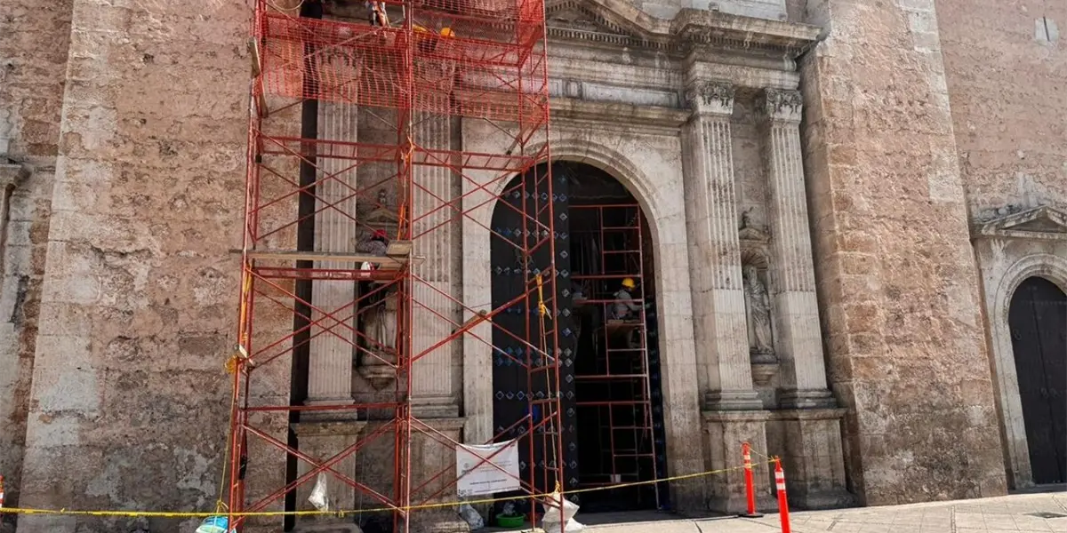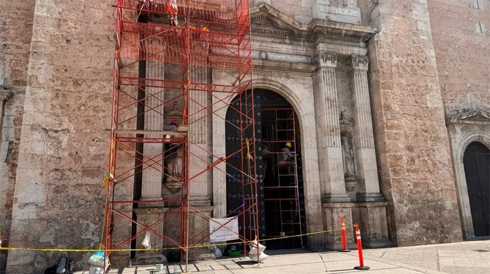 La Catedral de Mérida recibe intervención para retirar las pintas del 8M de 2023 y otras mejoras