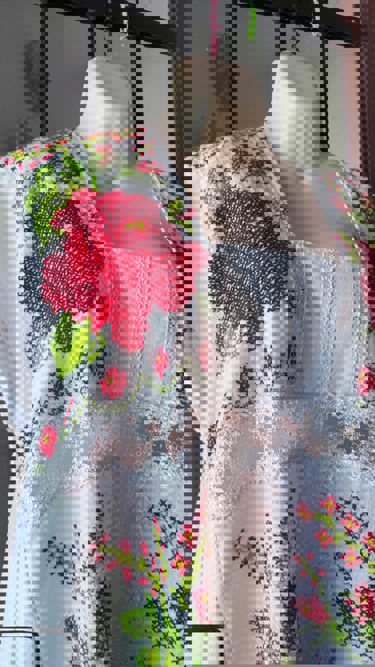 Son entre 15 y 20 mujeres las que tenemos en el grupo. Todo es hecho a mano, tanto el bordado como el punto de cruz. Con ellas hacemos todo el diseño, luego lo plasmamos en la ropa y después lo vendemos aquí en la tienda.